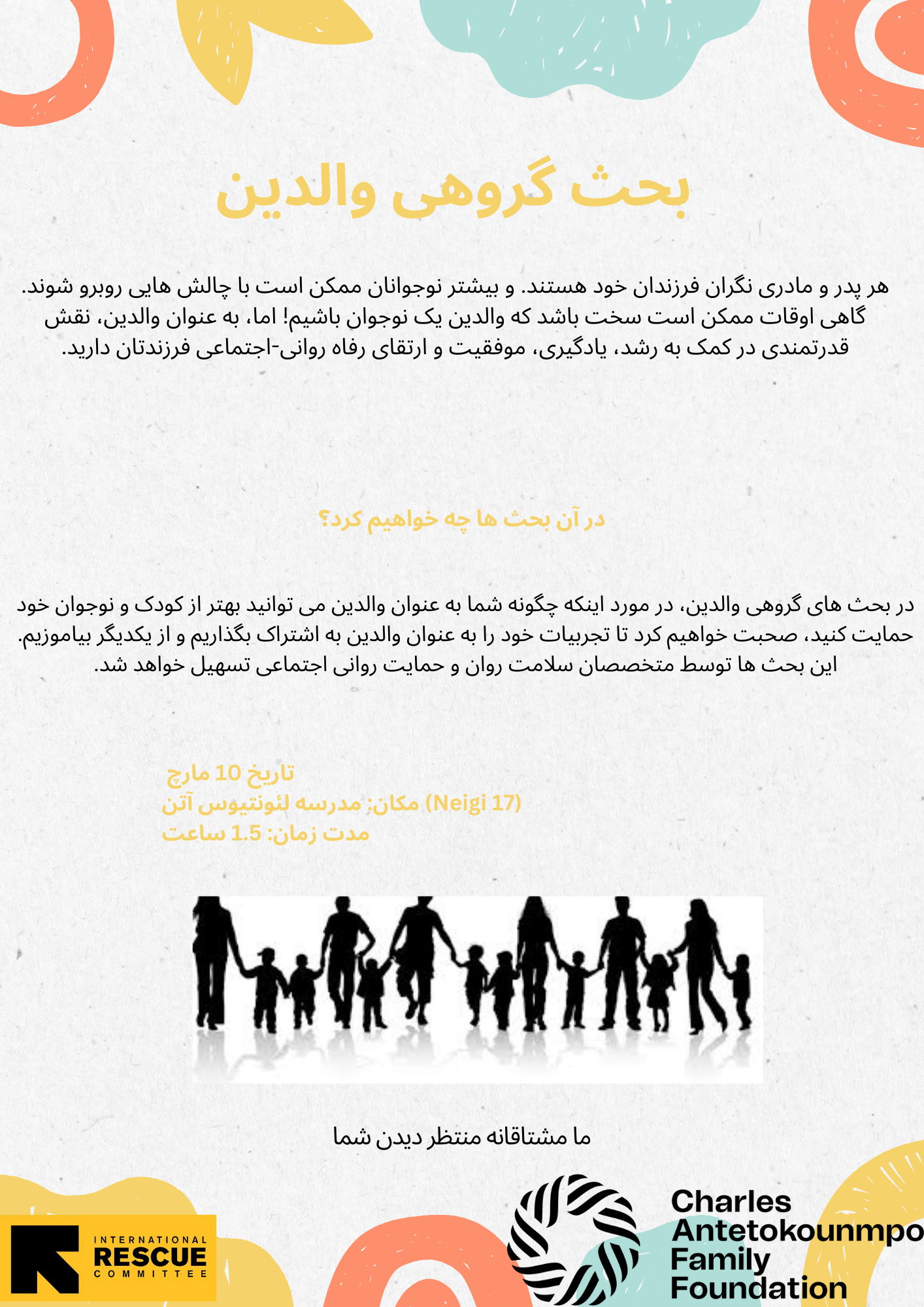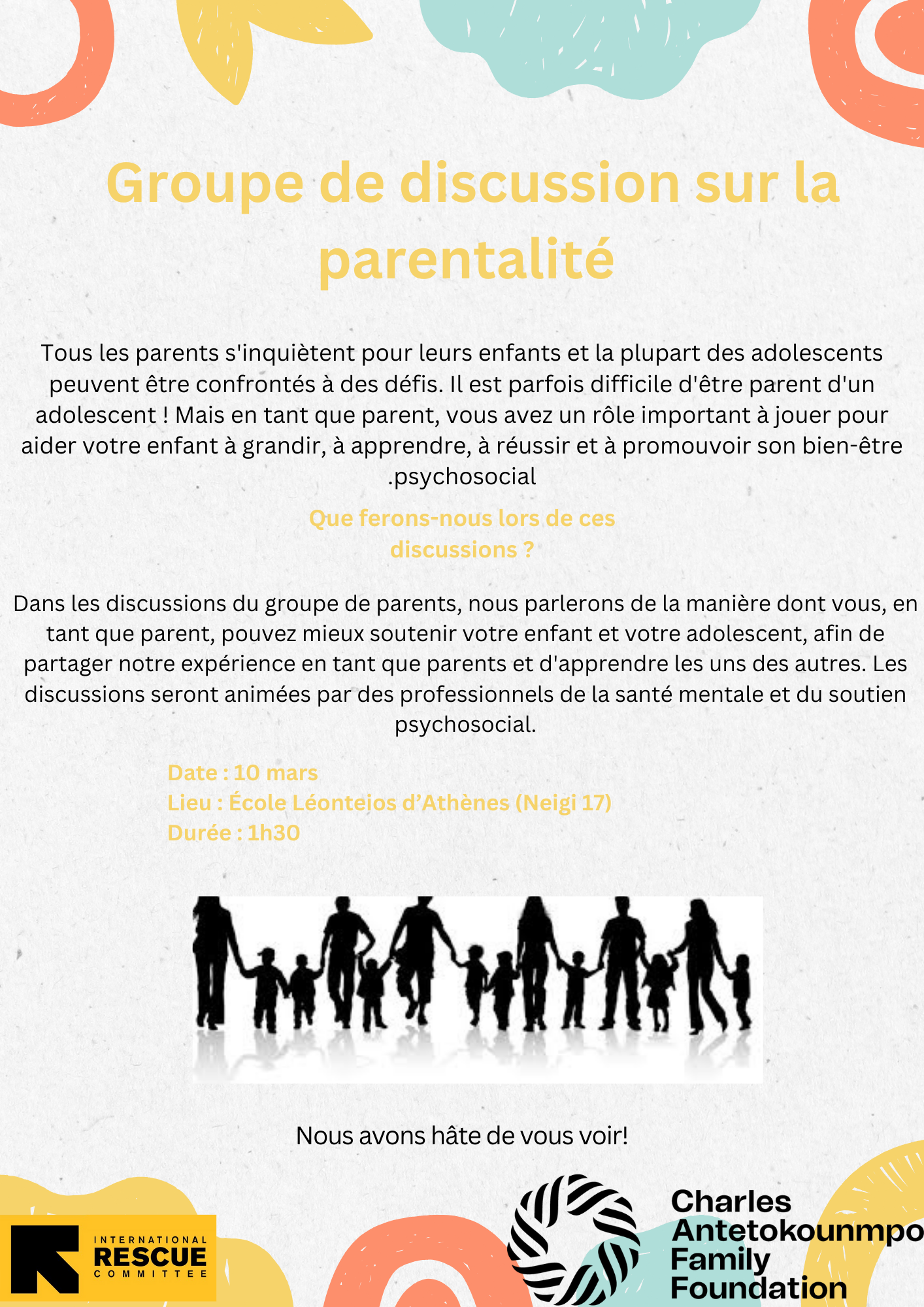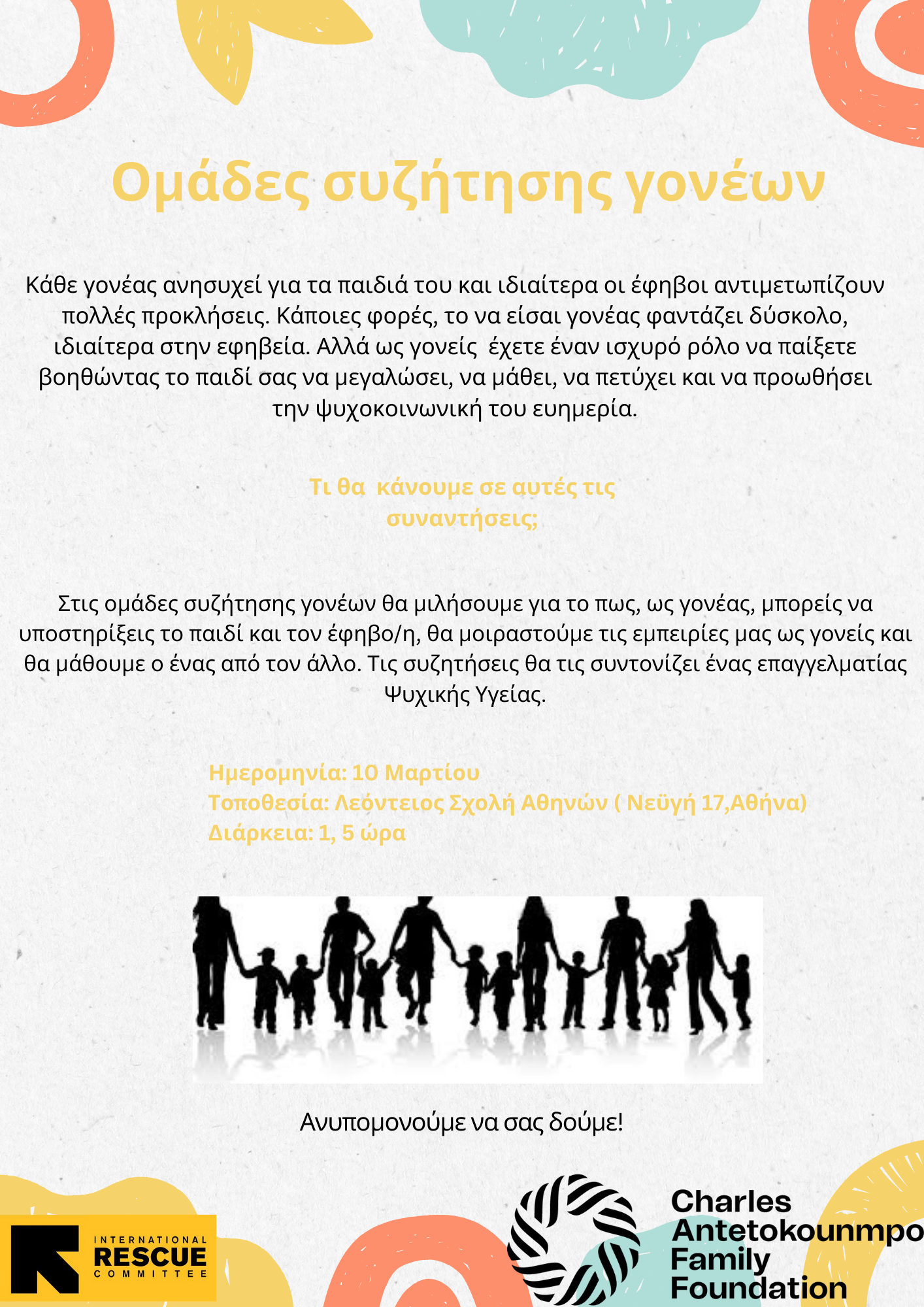 Πιστεύουμε ότι αυτό το εργαστήριο, σε συνεργασία με το IRC, μια έμπειρη οργάνωση που παρέχει ψυχοκοινωνική υποστήριξη σε κοινότητες που το έχουν ανάγκη, θα παράσχει σημαντική υποστήριξη στις οικογένειες της AntetokounBros Academy.